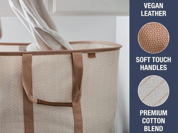 Collapsible Laundry Basket designed to revolutionize your laundry routine and organization needs. It's a versatile solution for toting dirty clothes, organizing space, or optimizing car storage during road trips. Made with the utmost attention to detail, these premium baskets are made with vegan leather accents, feature soft-touch handles for maximum comfort, and are constructed from a premium cotton blend, ensuring durability and a touch of luxury.